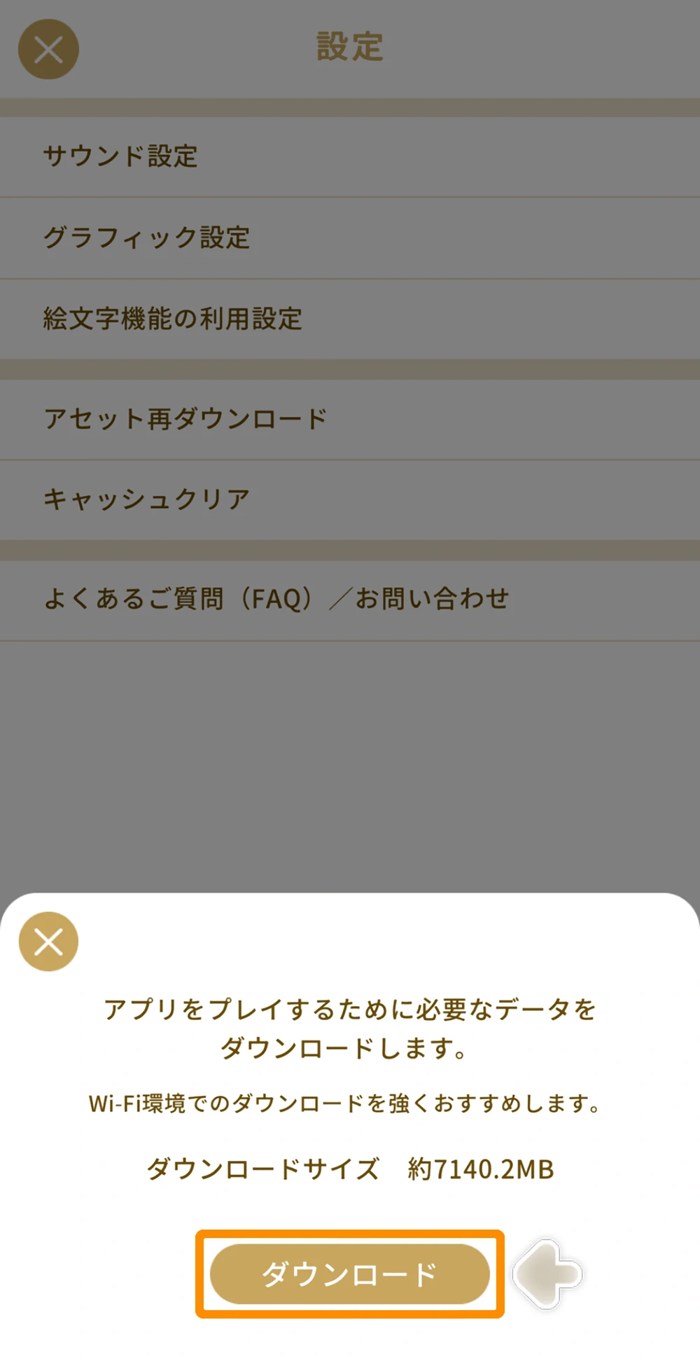 アセット再ダウンロードを行うには、まずタイトル画面右下のボタンをタップします。