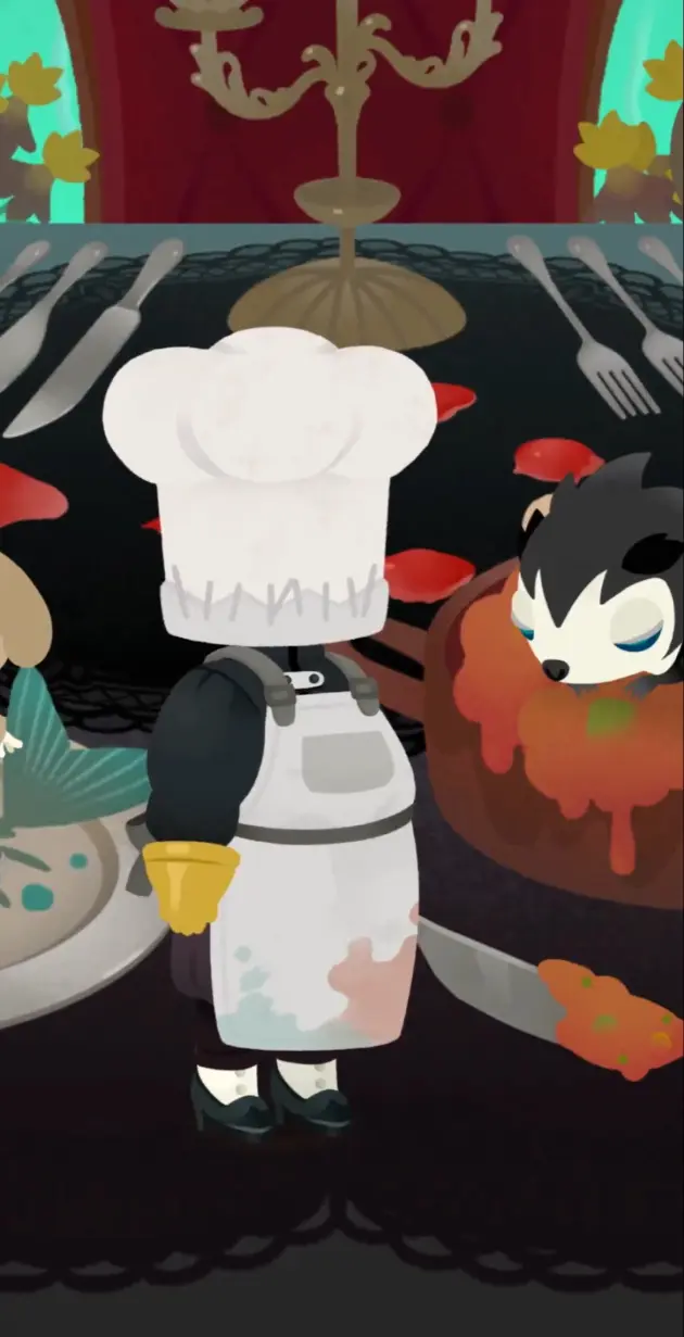 真っ白なシェフハットを被った不気味な料理長の姿も。屋敷の料理長として働く姿を演出。手にはナイフのようなアイテムを持っており、ホラーな雰囲気が広がります。