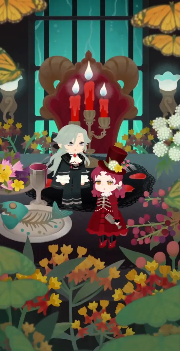 公開された画像では、まるで呪われた屋敷の晩餐会を思わせる、ダークで美しい空間が広がっています。黒いテーブルクロスには赤い花びらが散りばめられ、中央には燭台(おそらくツリー)が配置されるなど、細部まで作り込まれた演出が印象的です。