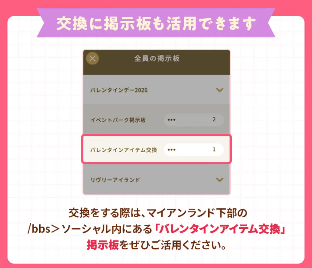 - 「バレンタインアイテム交換」掲示板で、自分が持っていないアイテムを募集・交換する。