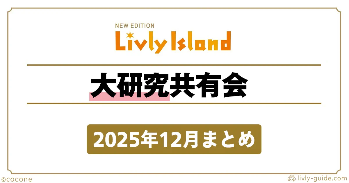 研究共有会とは、リヴリー研究所の研究員たちが最新の開発状況や今後のアップデート内容を紹介する、リヴリーアイランド公式のライブ配信イベントです。毎月開催されており、新リヴリーや新アイテム、季節イベントなどの情報がいち早く公開されます。