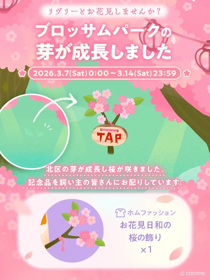 ブロッサムパーク北区で、芽が成長し、タップで限定アイテム「お花見日和の桜の飾り×1」が配布されます。