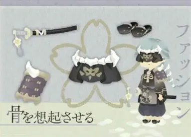 「こんばんは。今回は淡い色合いに白骨のモチーフを織り込んだ和装をご用意しました。散りゆく桜の儚さをファッションでも表現しています。はるか昔の姫や守護者たちの物語を想像しながら、お召し替えをお楽しみください。」