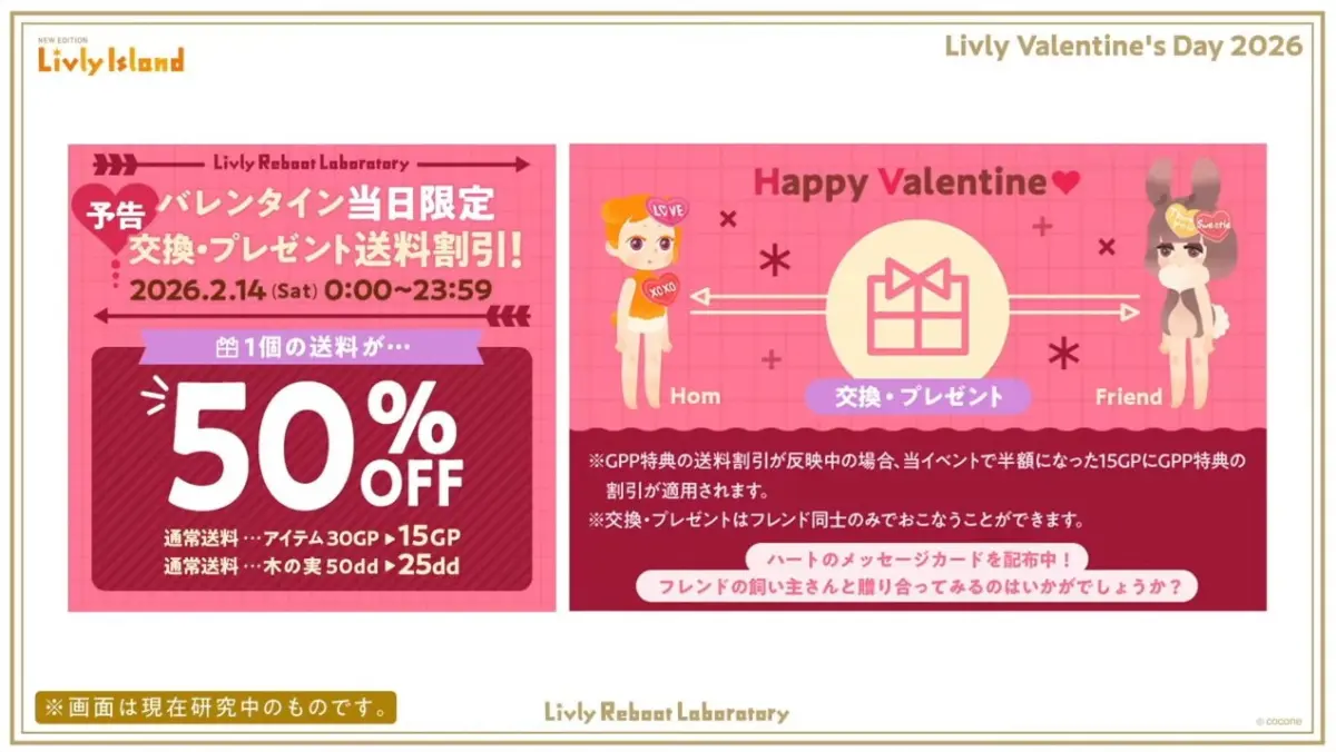 リヴリー2026年バレンタインは送料半額!2月14日限定でアイテム交換・プレゼントの送料が50%OFF(15GP)になります。